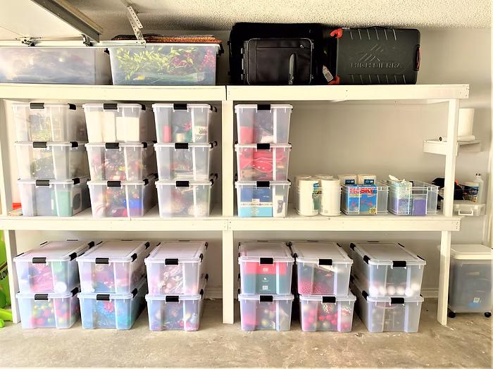 In the garage, we recommend storing “adult” utilitarian items separately from “kid” recreational items.
