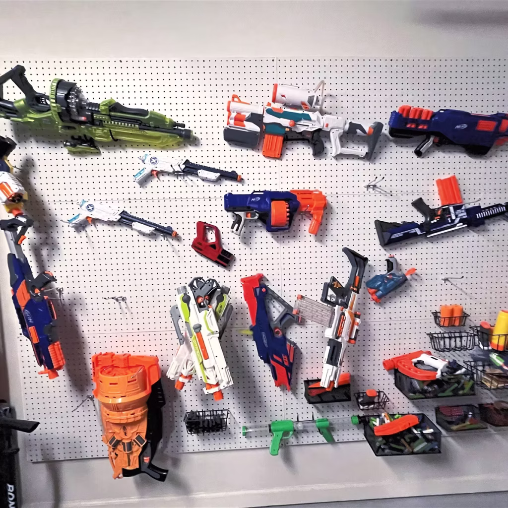 Not every toy belongs inside your home! Store balls, Nerf guns, and outdoor gear in the garage. Install a pegboard for Nerf supplies and put sports equipment in a triple sports bin. This keeps the equipment sorted and accessible.