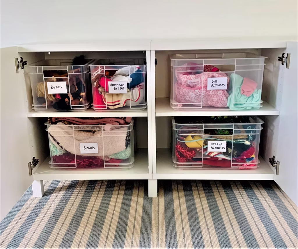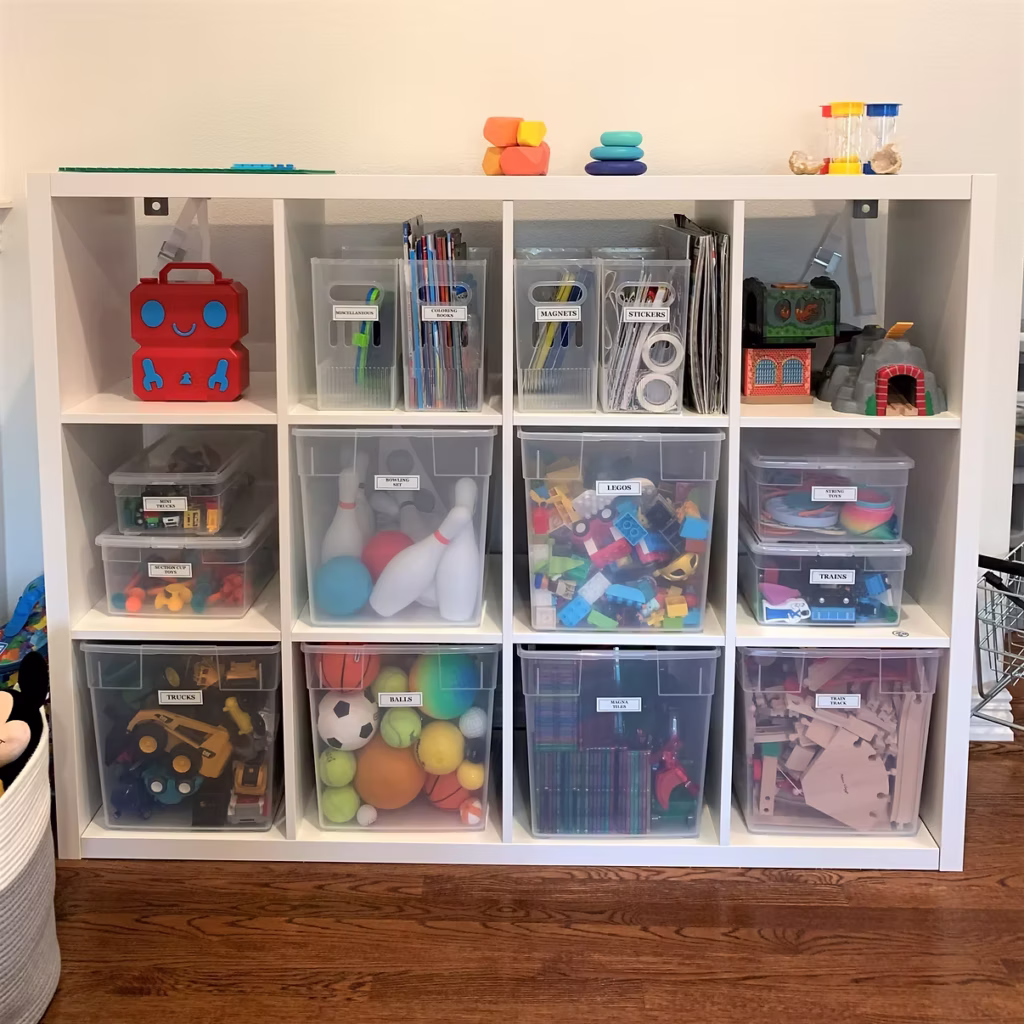 Store toys in clear bins whenever possible! It makes it easy for kids to see what they have and where to put it away. Some of our favorite bins include open-top Euro Crates for items that need quick access and lidded boxes for toys with many small pieces that need to stay together.