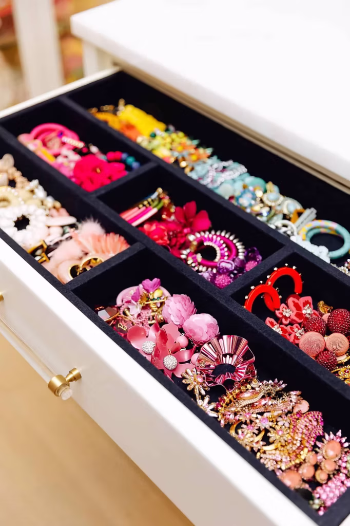 We created a jewelry system to keep every piece visible, protected, and easy to access. No more tangled necklaces or hidden favorites – everything has a dedicated, beautiful home.