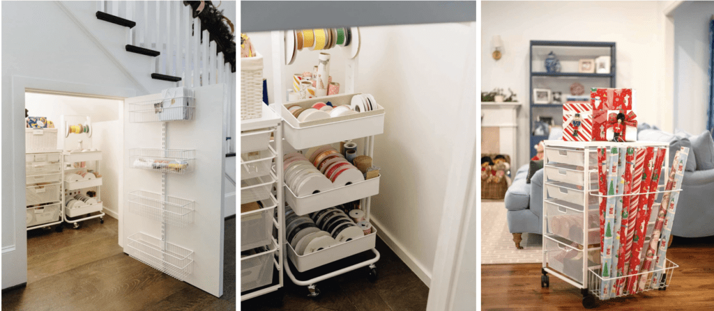 We recently transformed our client’s under-the-stairs nook into the cutest gift-wrap HQ, and the result is SO GOOD. Our IG followers loved this one. Check it out here! And while you don’t need an under-the-stairs nook to recreate the magic, you can create a mobile wrapping area that works just as well.