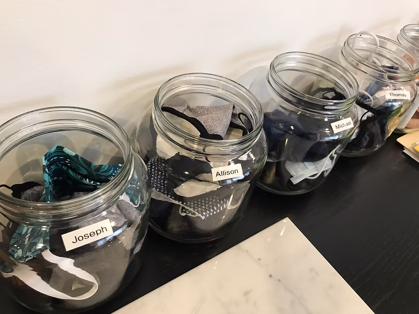 If it will be World War III in your home if you don’t separate masks by person, we recommend using a separate basket, jar, bin, or drawer with dividers for each person. Label each container and each mask by writing on the inside with a Sharpie or using iron-on name tags. This will simplify mask sorting, especially when many masks are similar in color and style. My children wear a uniform to school, so they mainly have navy blue masks to match, so the iron-on labels are a lifesaver!