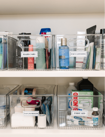 We highly recommend using clear bins to hold each category or person’s medicines. Clear storage allows you to locate what you need at a glance. You’ll be able to see exactly what you have, which prevents you from purchasing duplicates and helps you see when you need to replenish a supply before you run out.